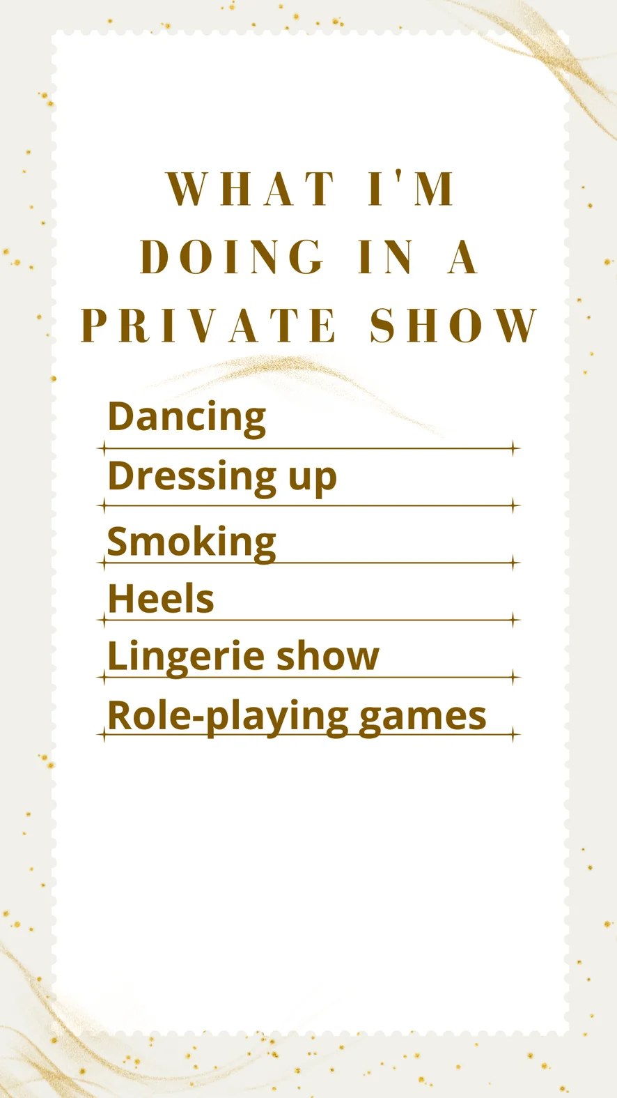 Valutazione del cazzo, Ballo erotico, Sculacciate, Mistress, Linguaggio esplicito, Donna sopra, Giochi di ruolo, Feticismo dei piedi, Twerk, Facesitting, Tradimento, Zoccolo di cammello, Spogliarello, Umiliazione, Sega, Istruzioni per sborrare, Yoga